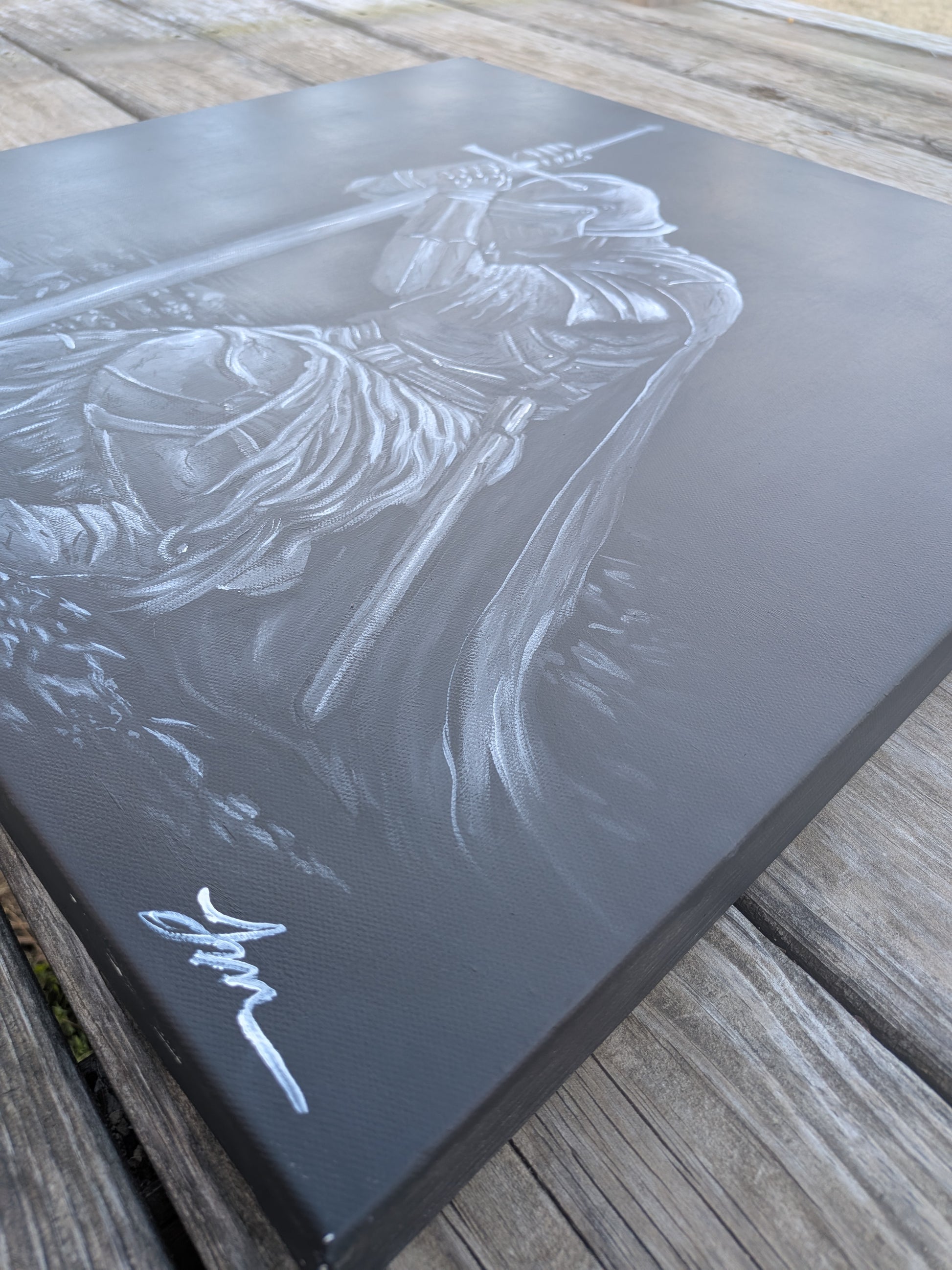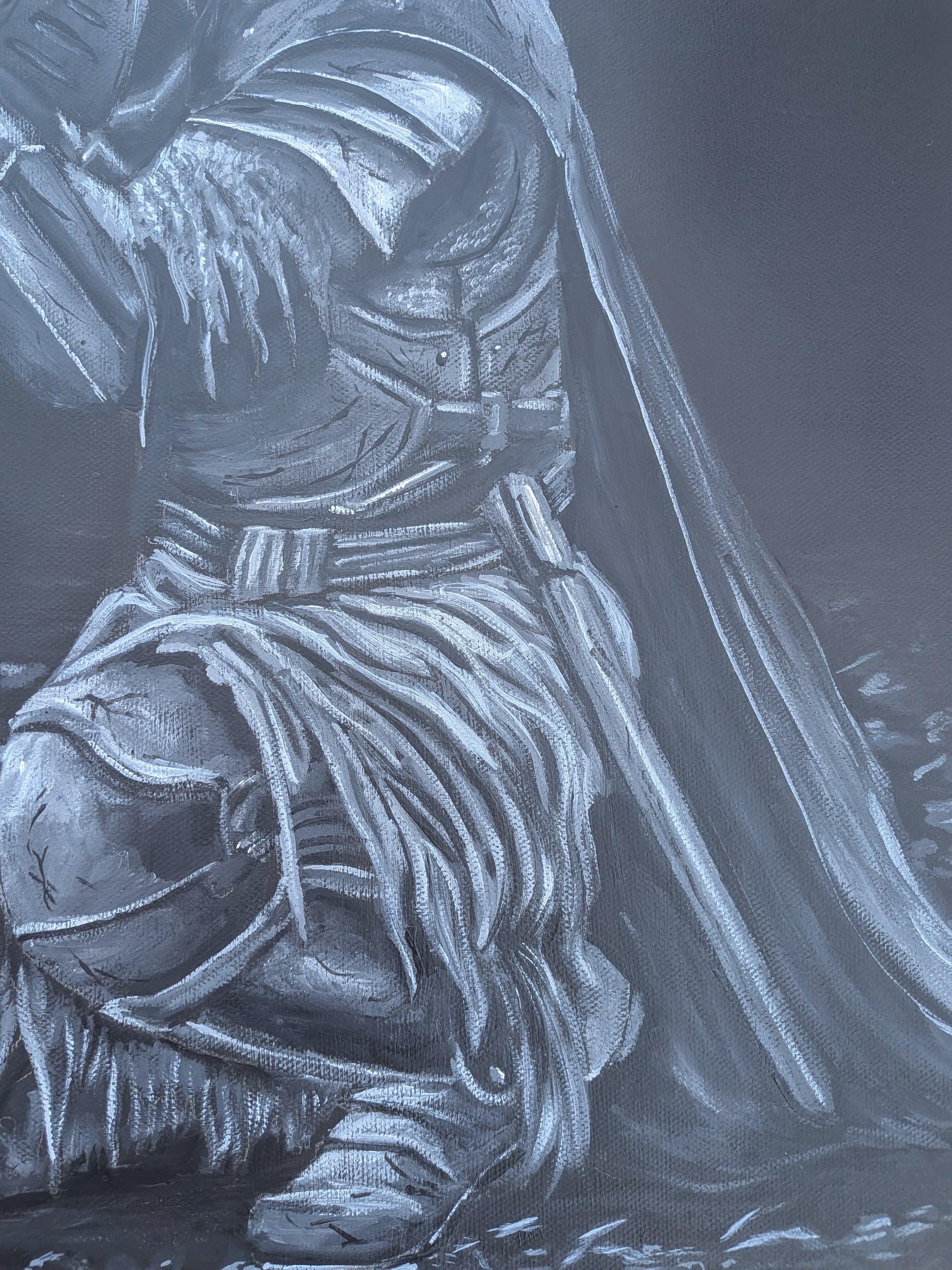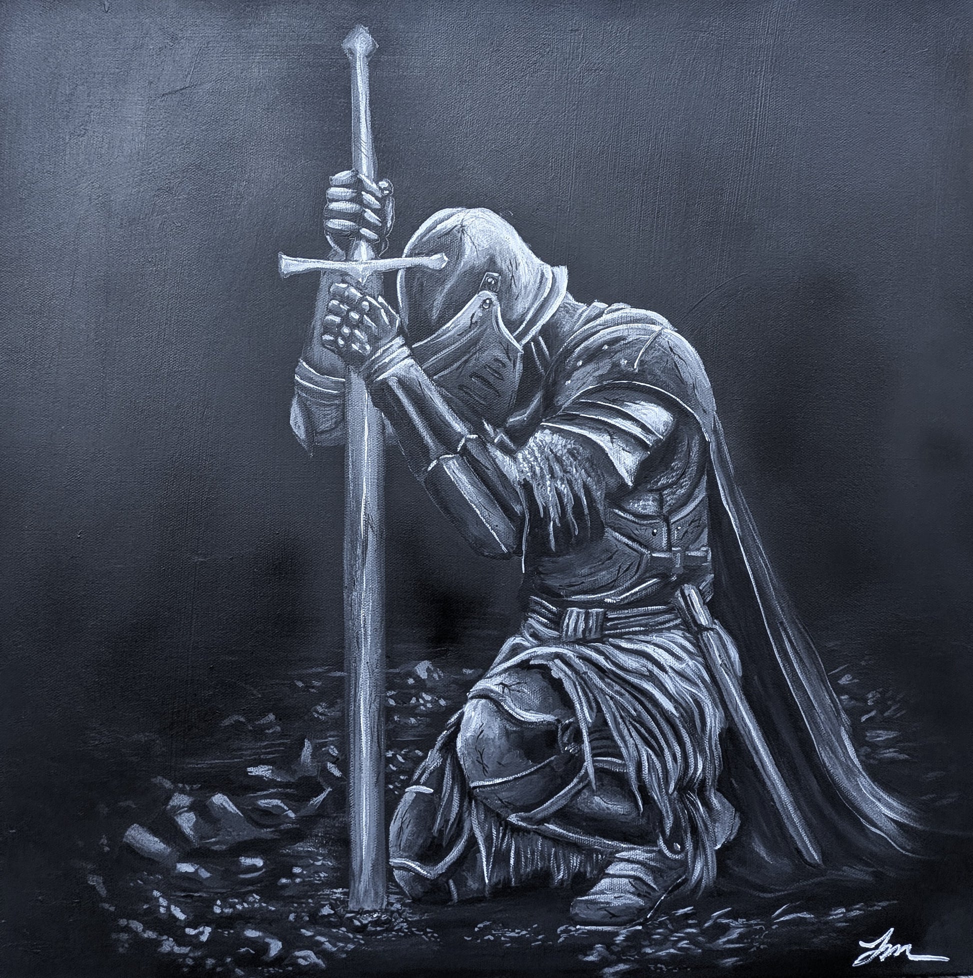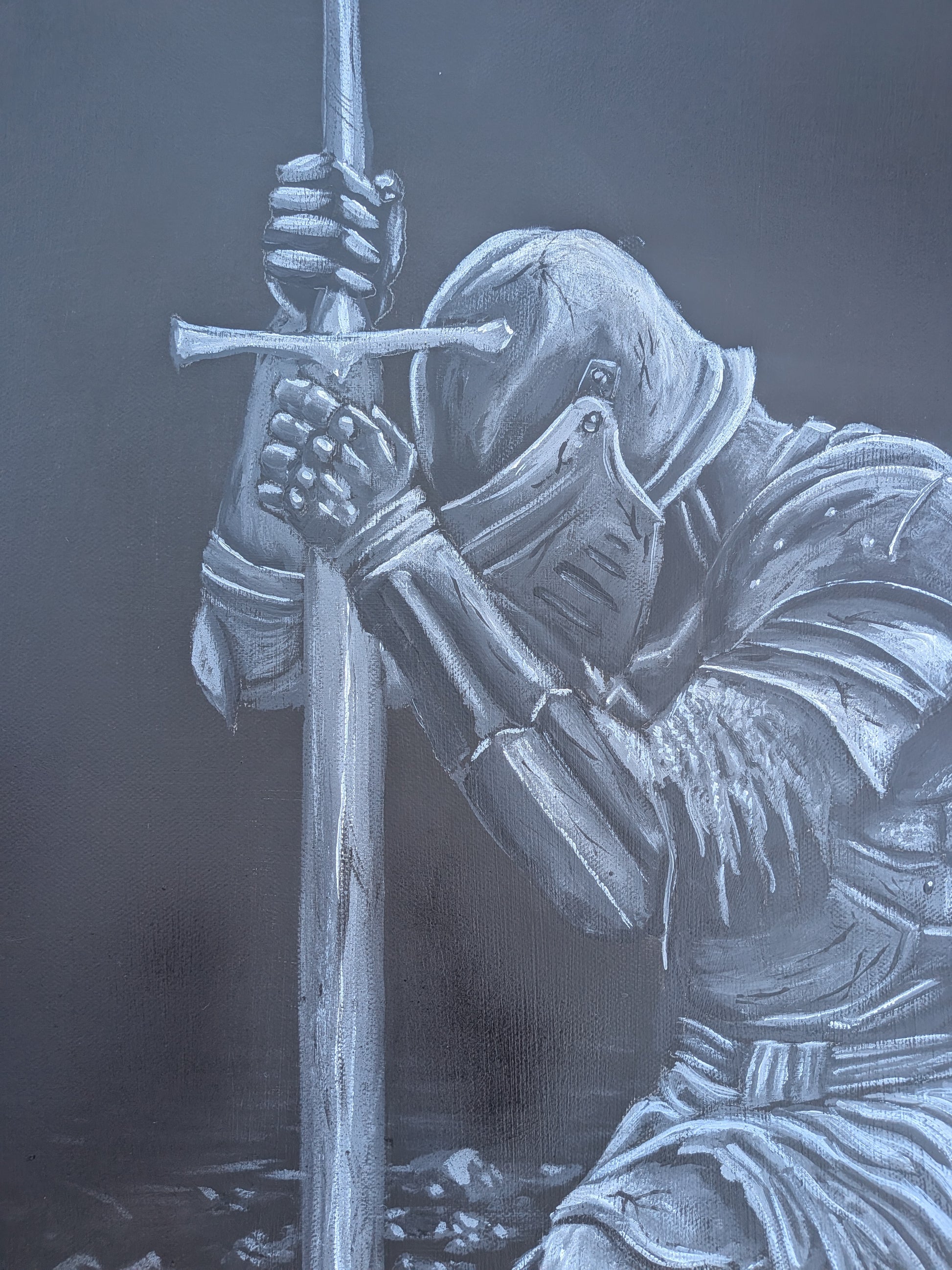 This original hand-painted acrylic piece depicts a kneeling knight, armor worn and heavy, sword planted firmly into the ground. It is a moment of stillness after battle, not defeat, but devotion. A reminder that strength is not always found standing, and that protecting the heart often requires humility, faith, and resolve.