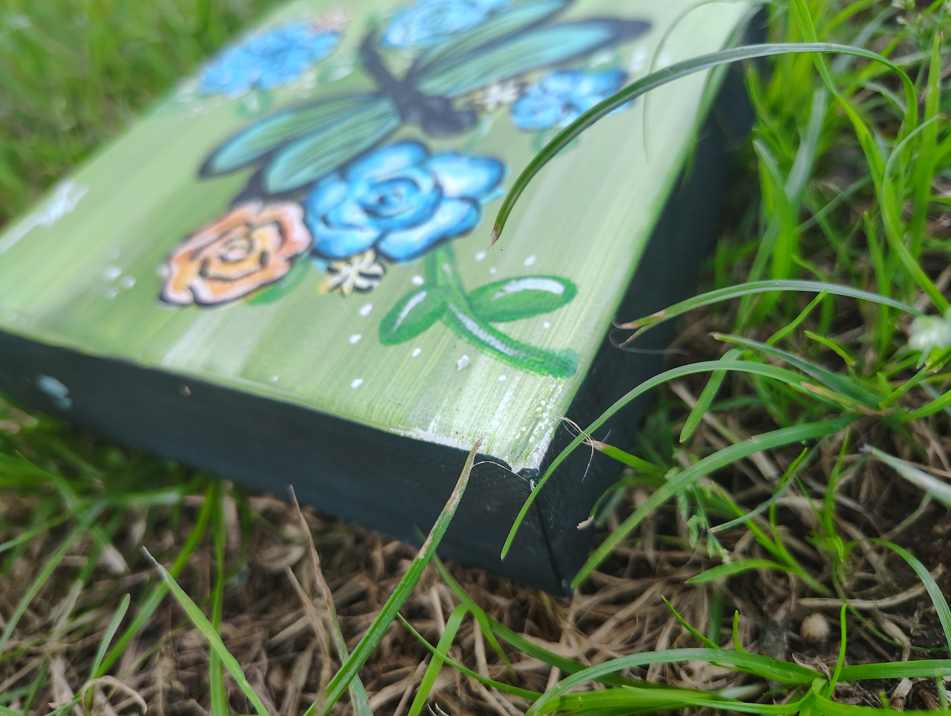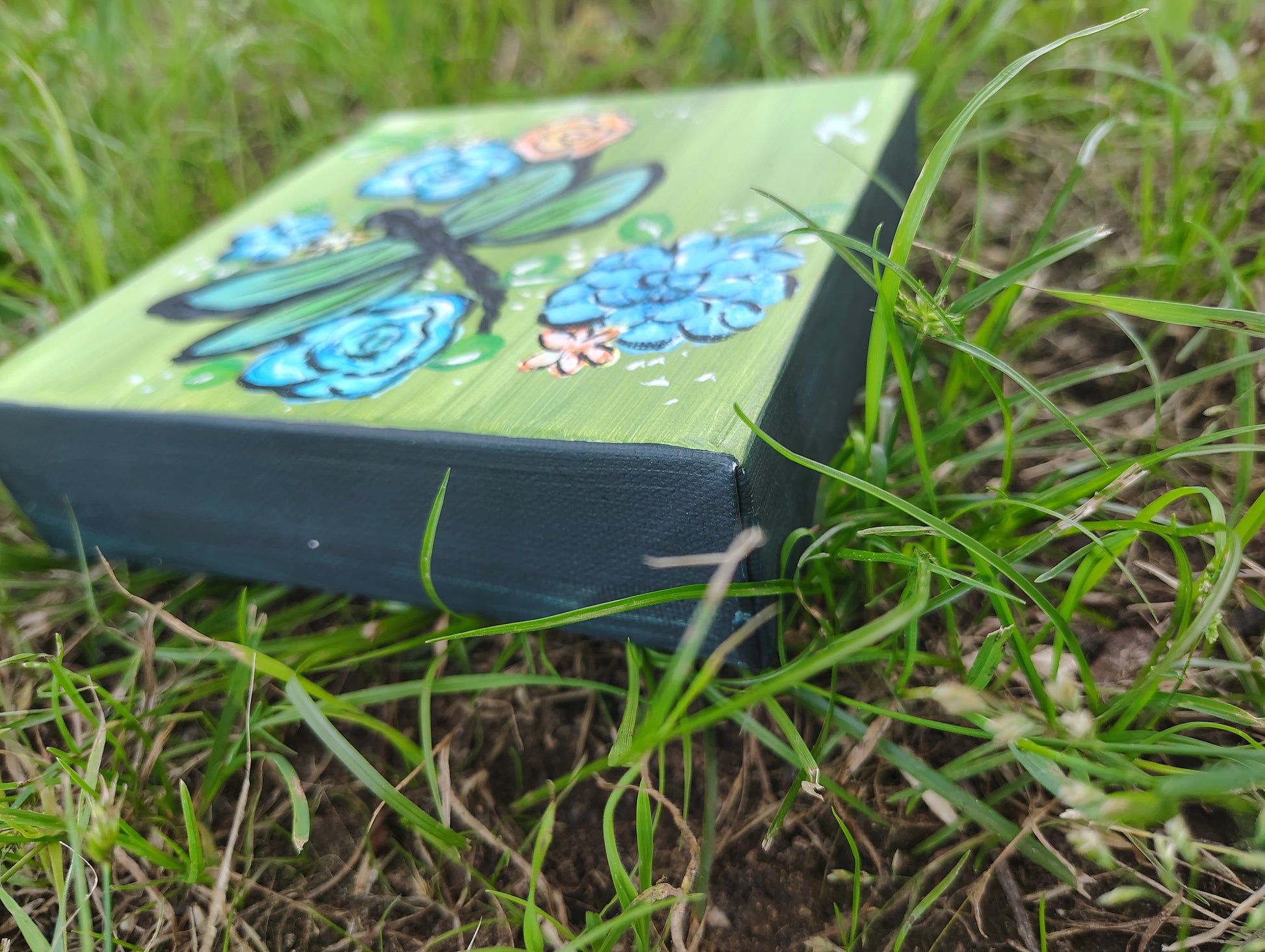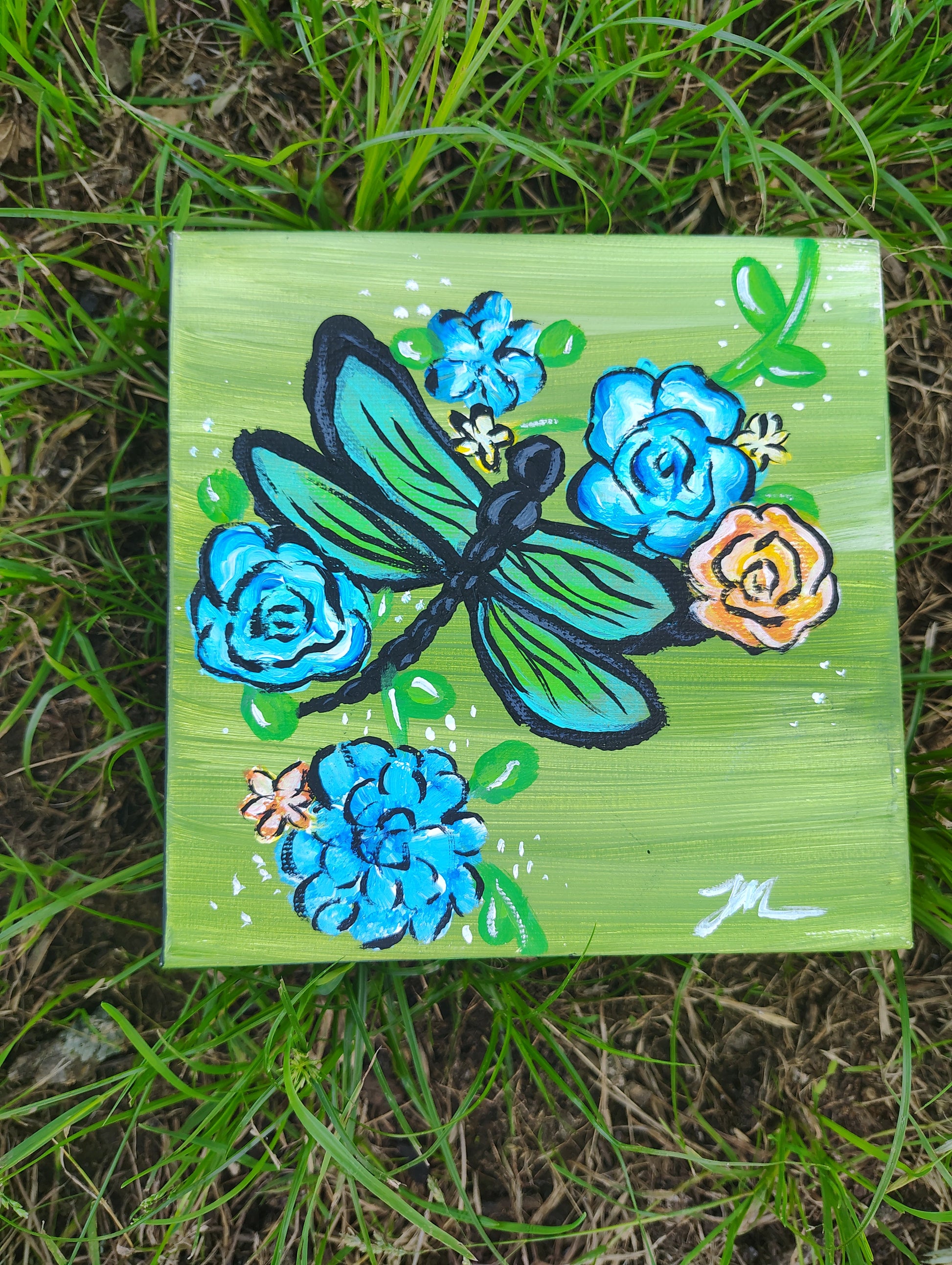 Bring a breath of nature and whimsy into your space with "Garden Whispers", a vibrant original acrylic painting on a 6x6 inch gallery-wrapped canvas. This hand-painted piece features a striking green butterfly nestled among blooming blue and golden florals, all set against a fresh, grassy green background. Tiny white accents give the artwork a magical, dew-kissed touch.