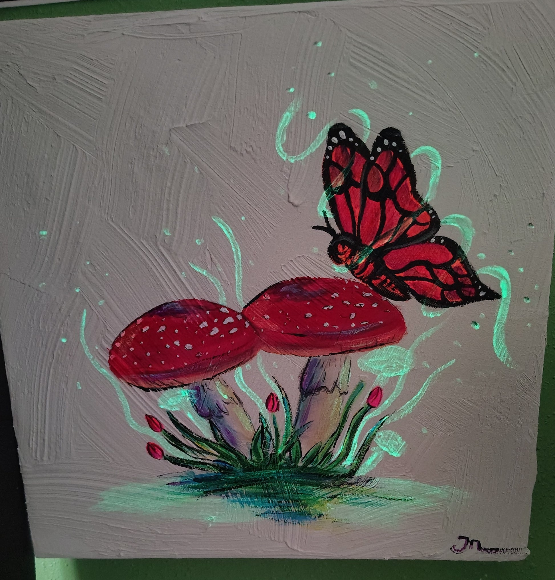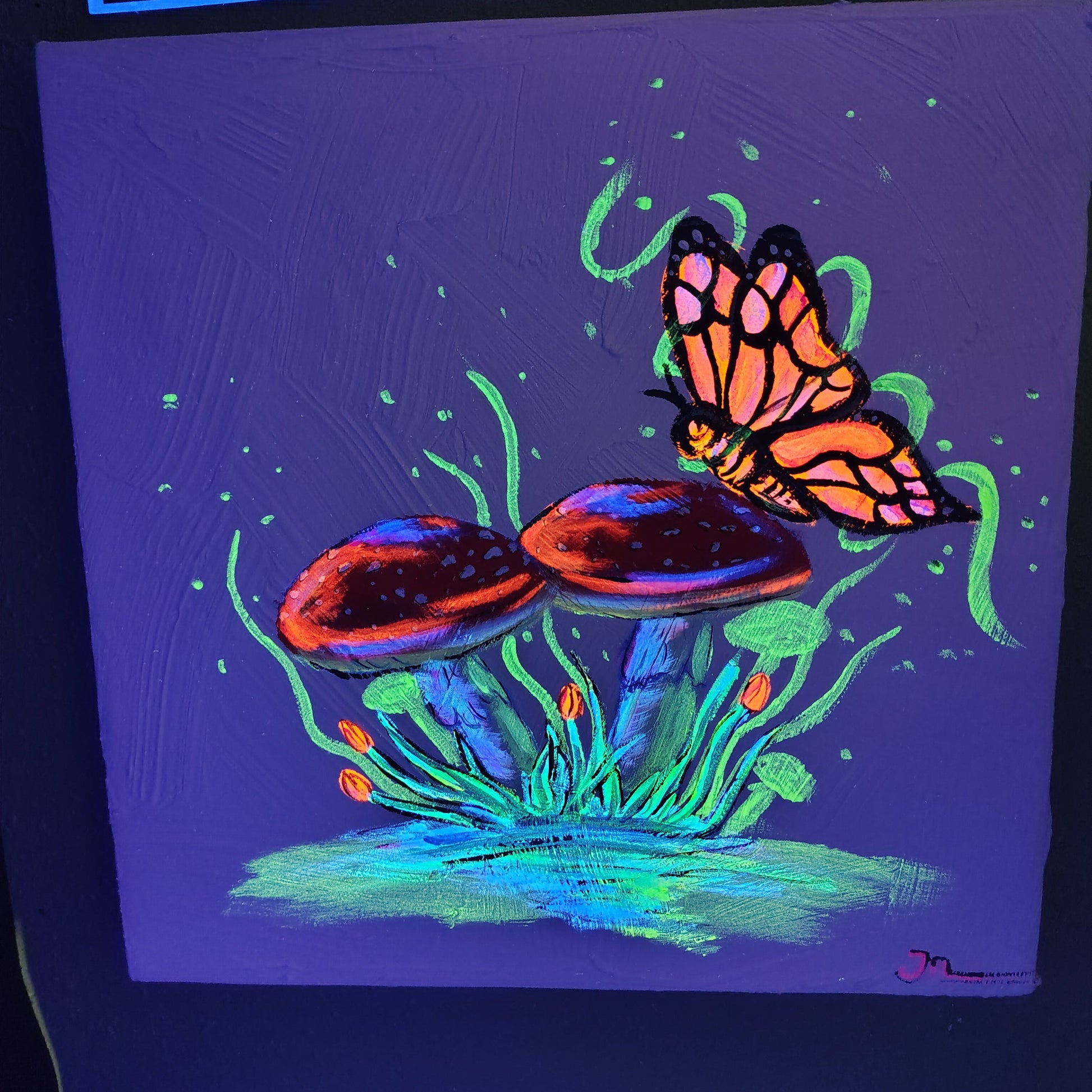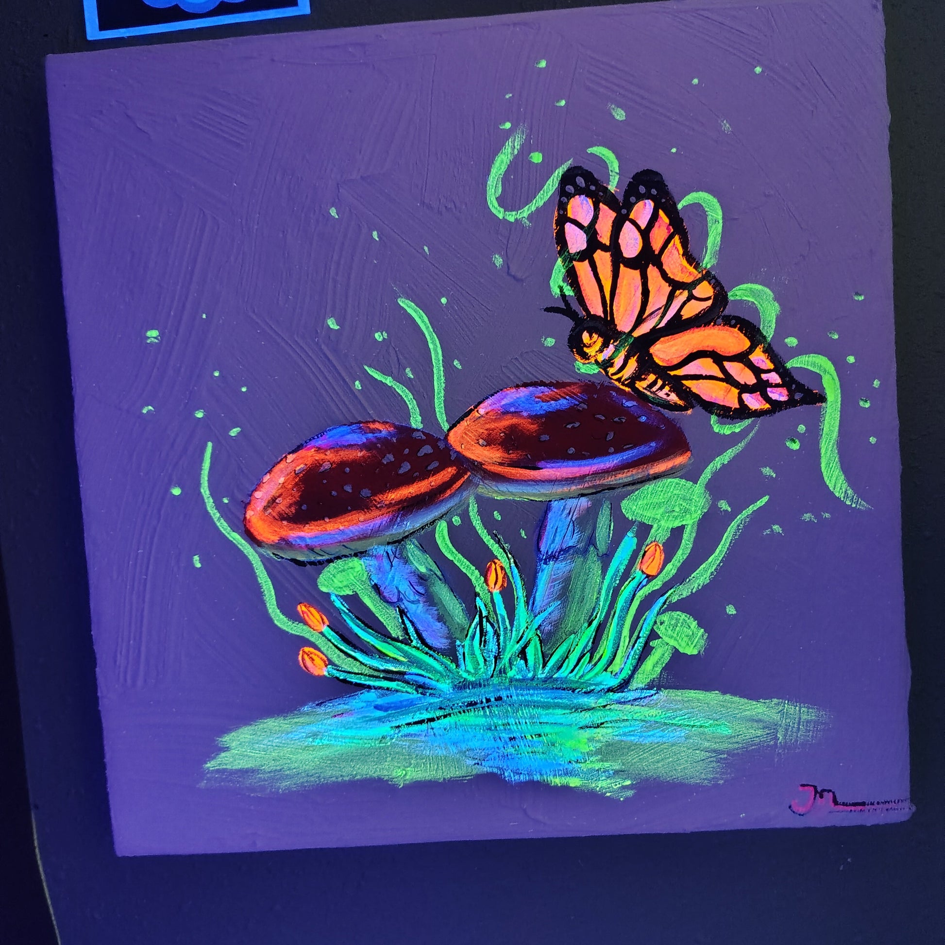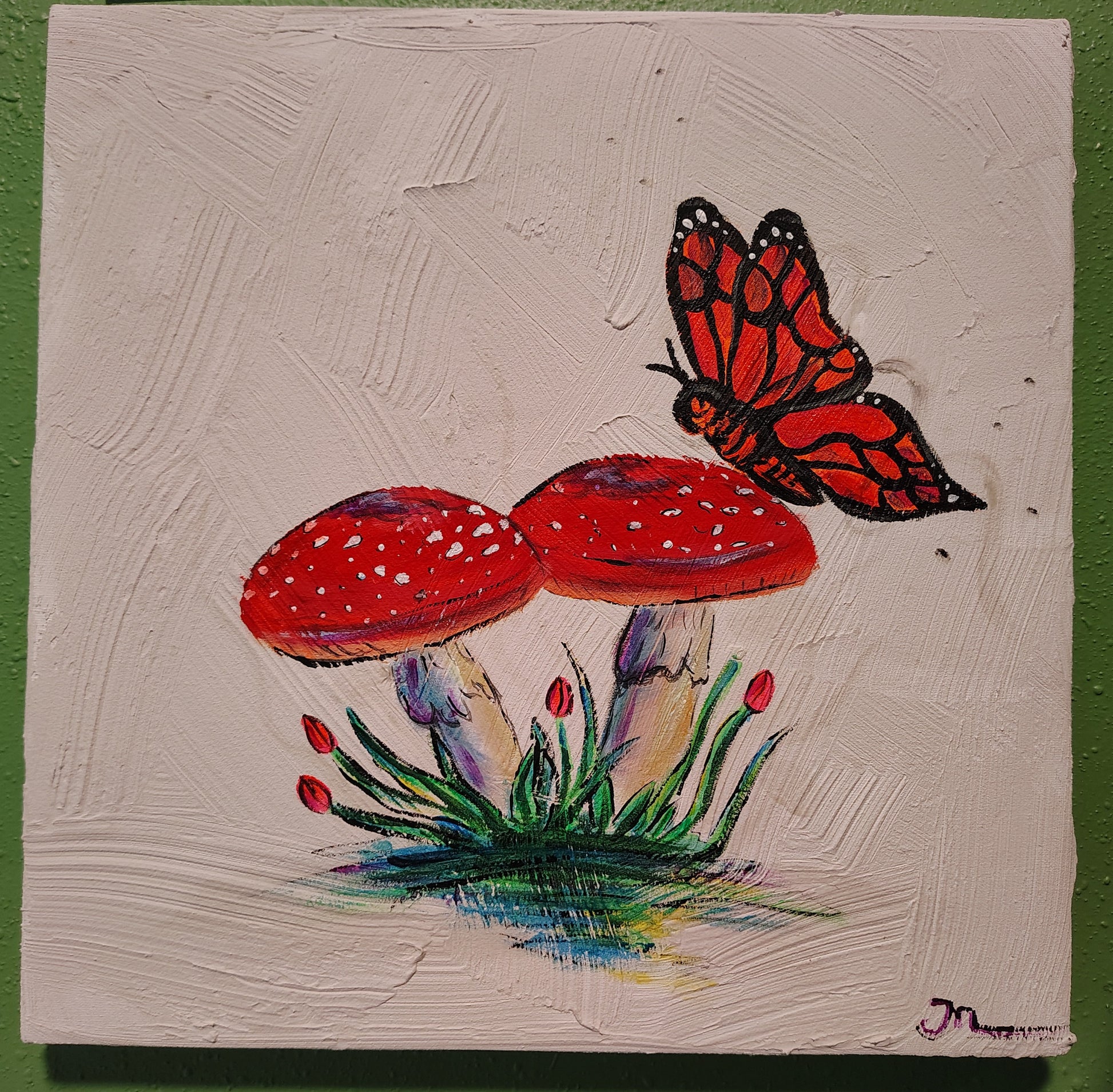 Step into a whimsical moment of nature with "Perspective", a vibrant hand-painted acrylic artwork that captures the magic of quiet observation. A delicate monarch butterfly hovers near a pair of bold red mushrooms, both grounded in lush, colorful undergrowth. With rich texture from the gesso board and expressive brushwork, this piece reminds us that beauty often lies in how we choose to see.