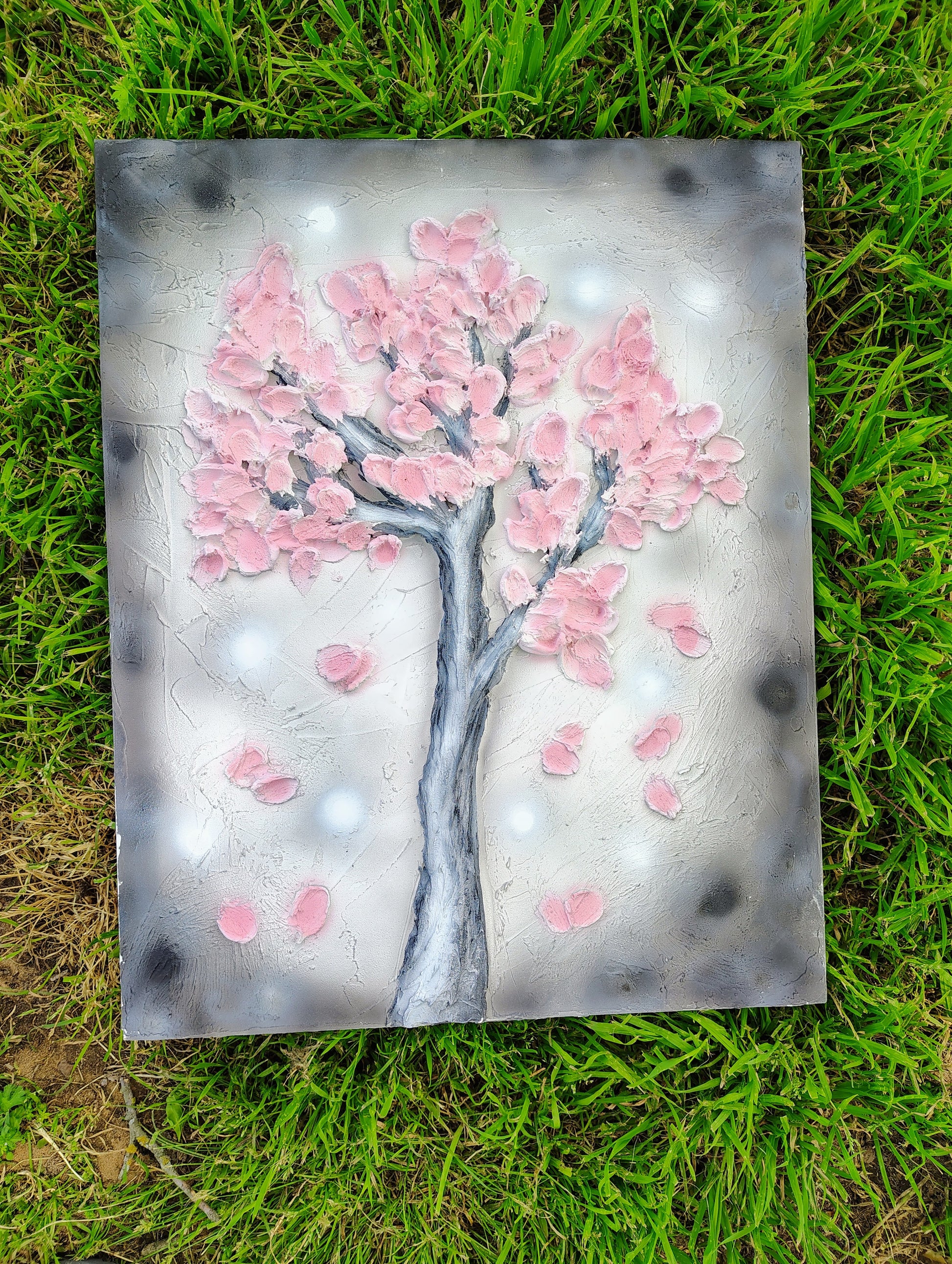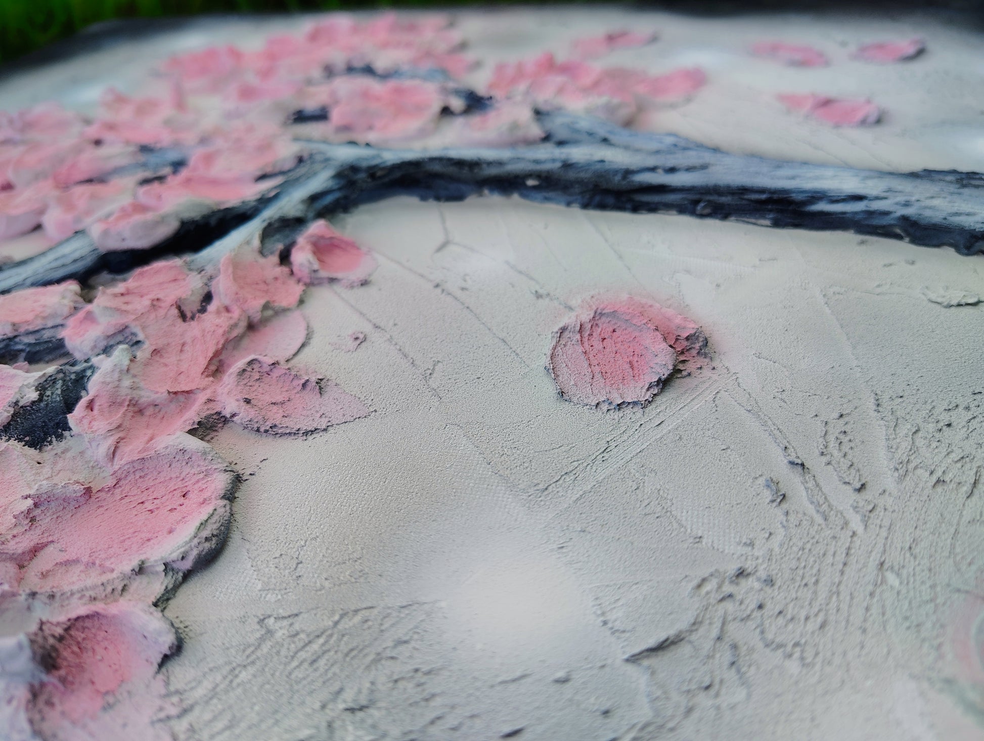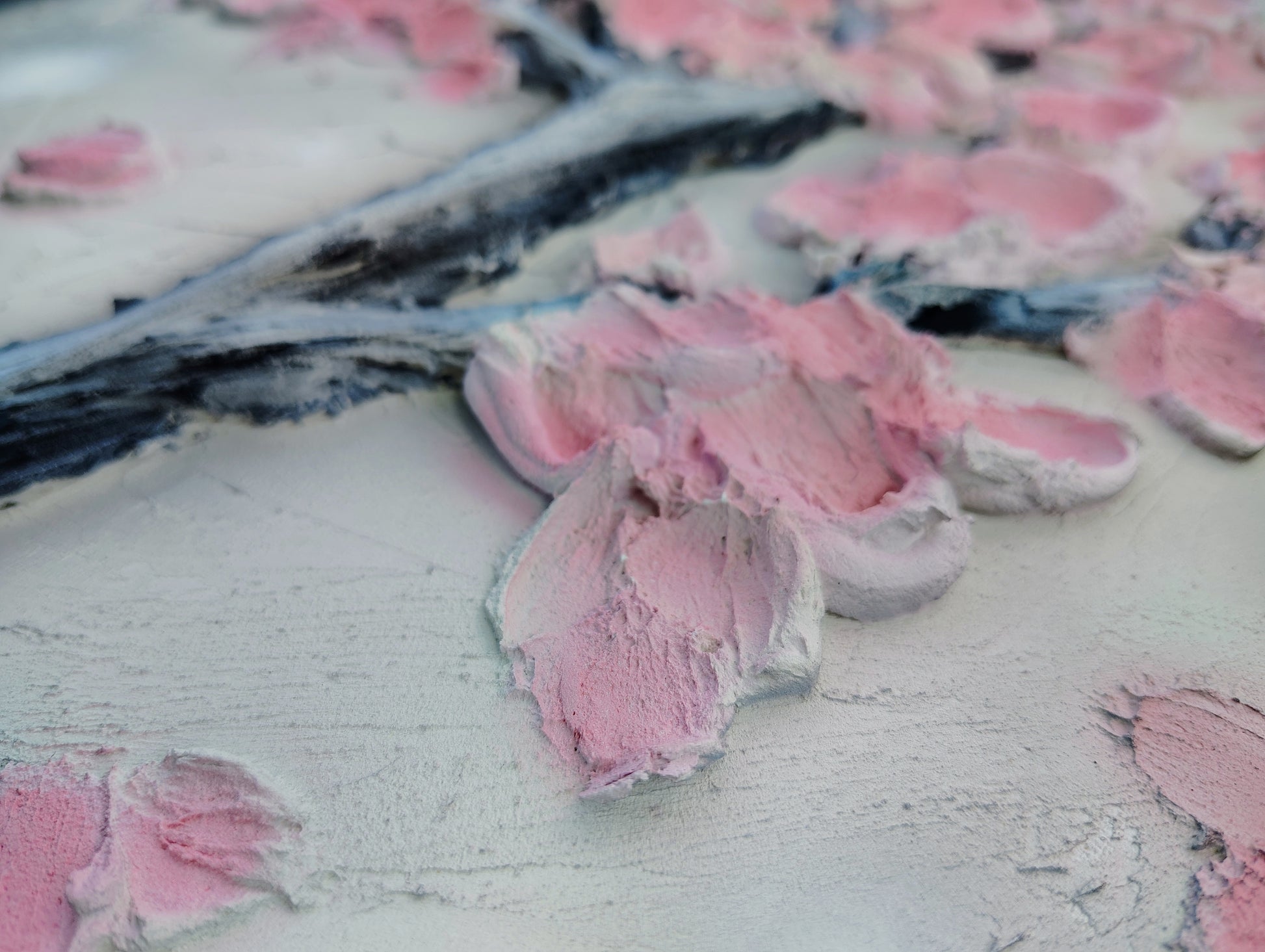 Textured Cherry Blossom Painting - A art piece with raised blossoms and a natural tree trunk effect, perfect for adding charm to any space. Custom-created using mixed media and acrylics on canvas.