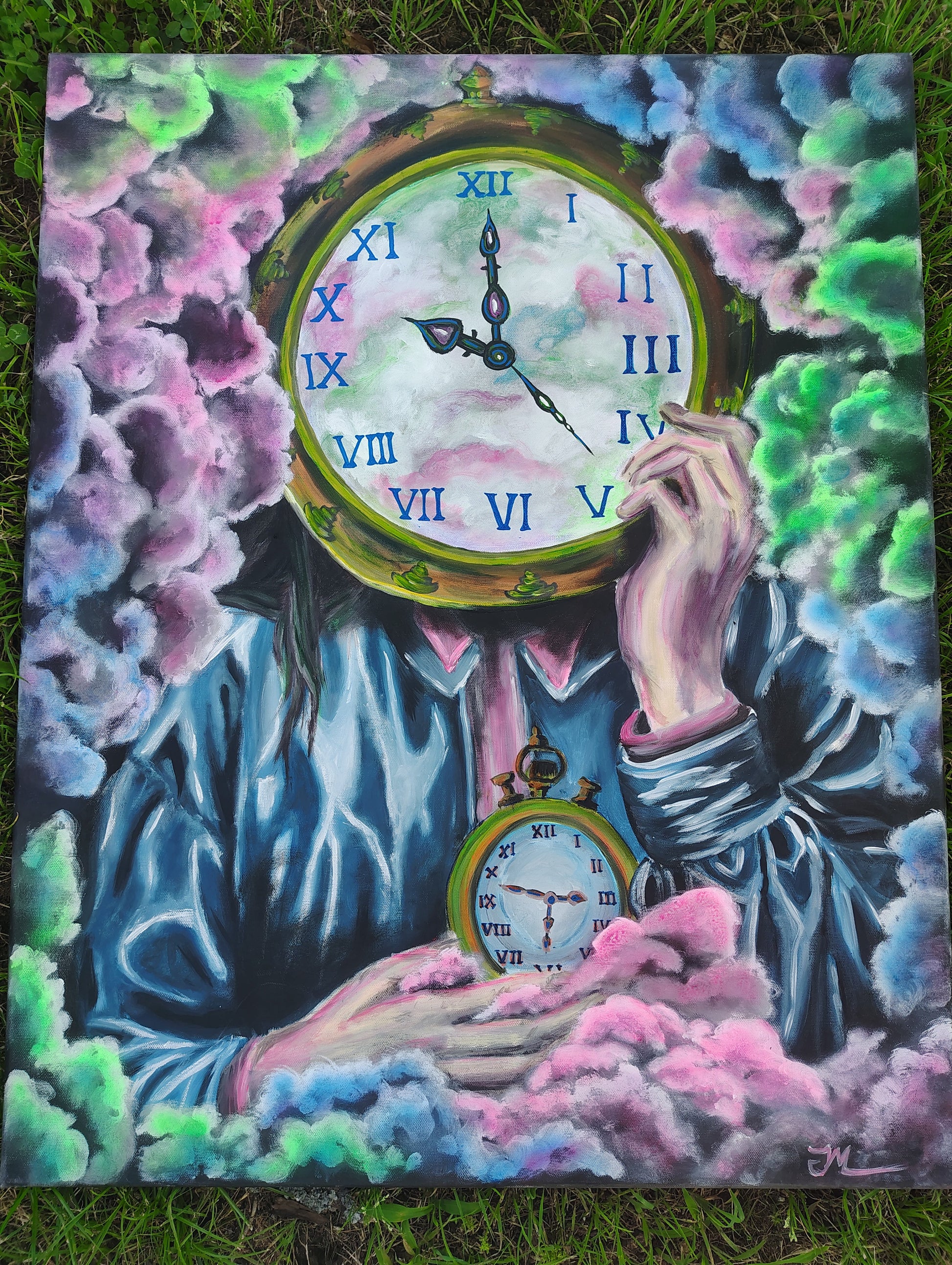 Step into the surreal with "Time", a captivating UV-reactive acrylic painting that explores the illusion, weight, and fluidity of time itself. Painted in mesmerizing hues of purples, blues, and greens, this piece features a figure cloaked in dreamlike clouds — their face replaced by a luminous antique clock, while they cradle a pocket watch in their hand.